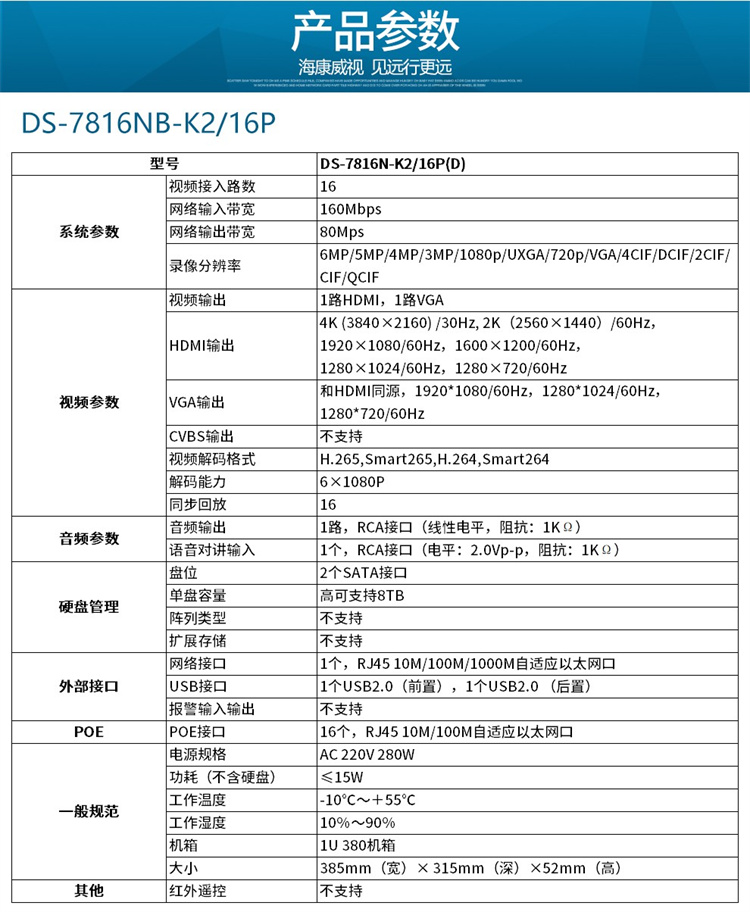 海康威视 DS-7816N-K2/16P 海康威视网络监控硬盘录像机16路带POE 不带硬盘